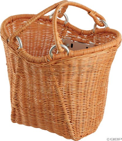 Dimension Rattan Baskets for on and off the bike with included handles that are great for carrying around. Features: Wide Rattan basket size is 13 x 10.5 x 10" Rattan front basket with TIG-welded inner aluminum frame for durability Basket has handles for use off the bike Weight limit of 5lbs 808 grams