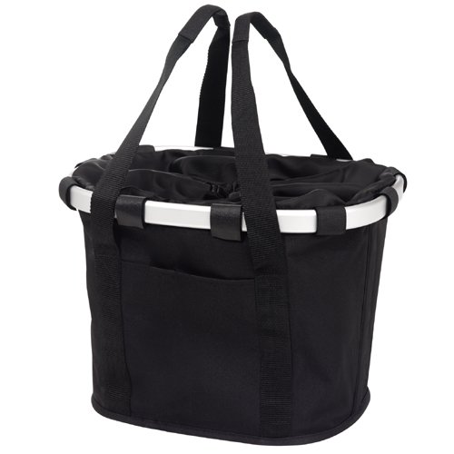 Volume is 15 liters (about 4 gallons). The bike basket is a racy, mobile bicycle version of the carrybag basket. Maximum security is guaranteed, in order to ensure that not only its contents but also cyclists themselves reach their destination safely after shopping. The bike basket's strong aluminium ring is simply hooked onto the handlebars by means of a universal fastening element. The cover flap sewn on the edge prevents loose objects from tumbling out during a bumpy ride and also protects against rain. Inside there is a pocket for a mobile phone, a zip pocket and a small multi-purpose pocket for belongings that is attached to a strap with a snap hook. The basket can carry up to 5 kg (10 lbs). We recommend that the diameter of the bike handlebars be between .08 and 1.04 inches, and that the customer check beforehand if they can attach a 26 cm high basket 10.2 inches) to their bike. Sometimes the distance between the handlebars and the lamp is smaller than 26 cm, (10.2 inches) so the basket can't fit on the bike.